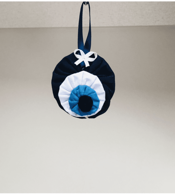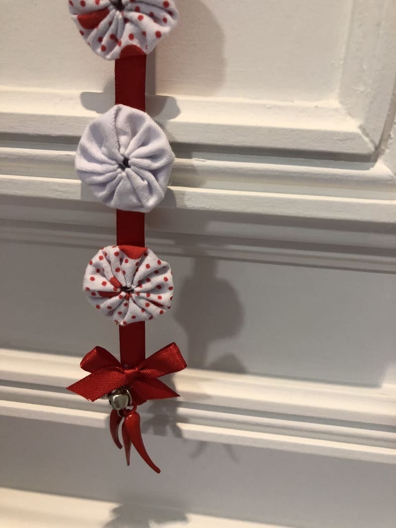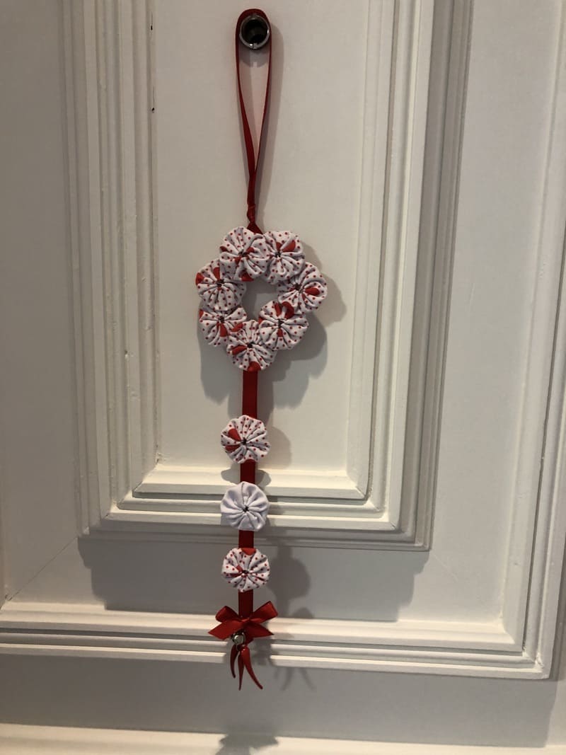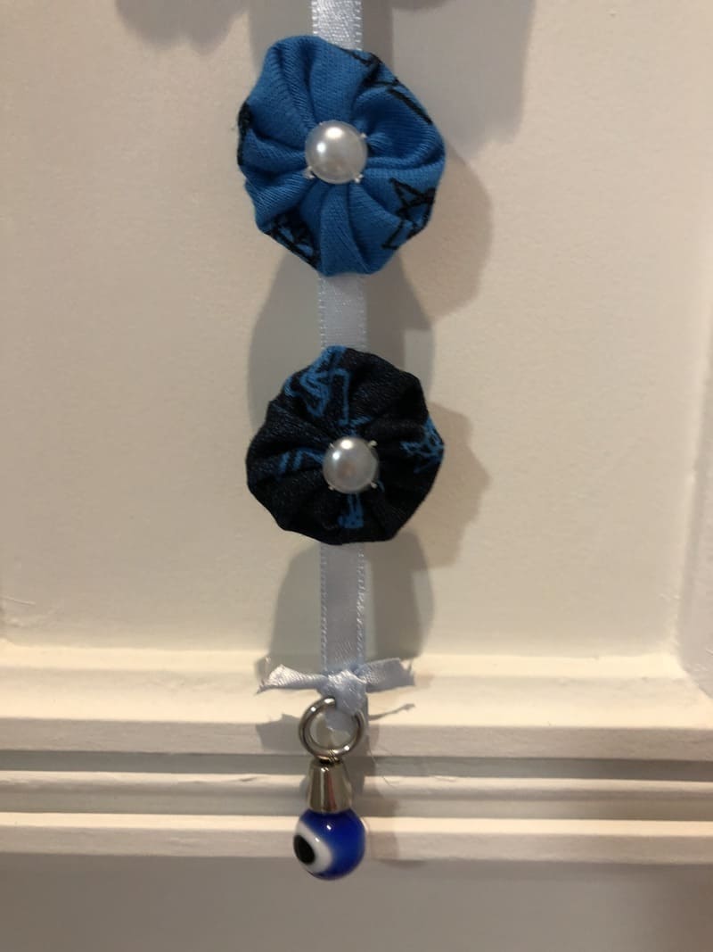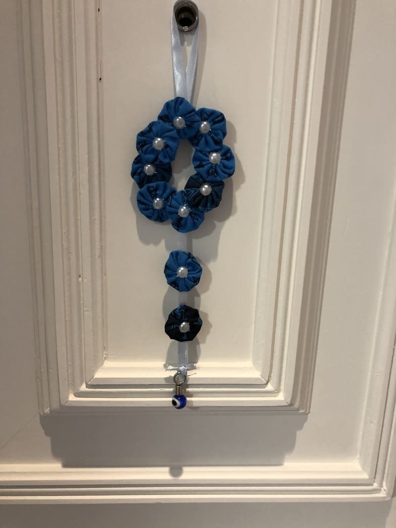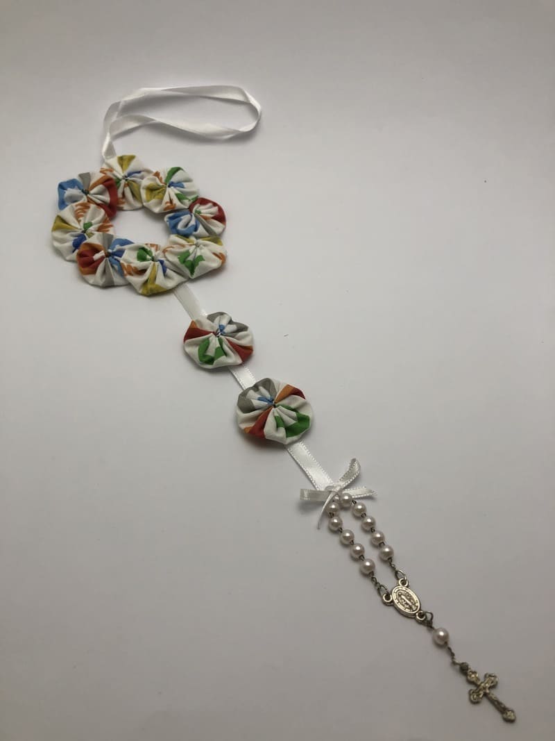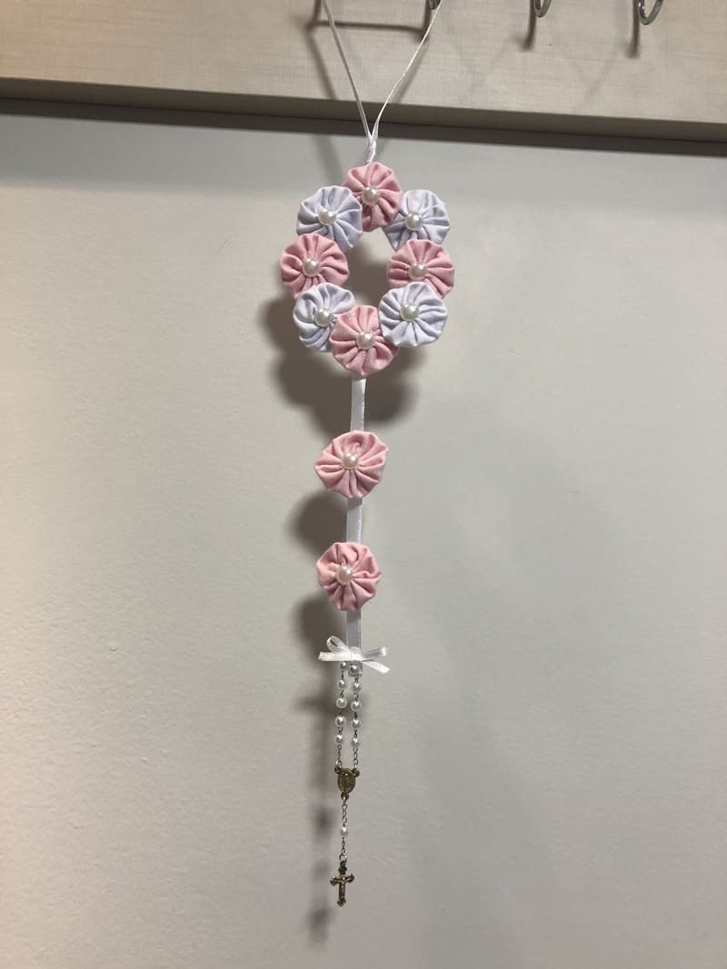 Para alegrar a casa, o quartinho do bebê e a porta do quarto na maternidade enfeites feitos em fuxico com detalhes como pérolas e mini terço.